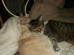 #227 Two simultaneous purrs from very contented cats, one sounding very much like a pigeon or dove, and the other louder and deeper in tone, sounding more like a small muffled motor. Hence his name, “Briggs” for Briggs and Stratton motor company.