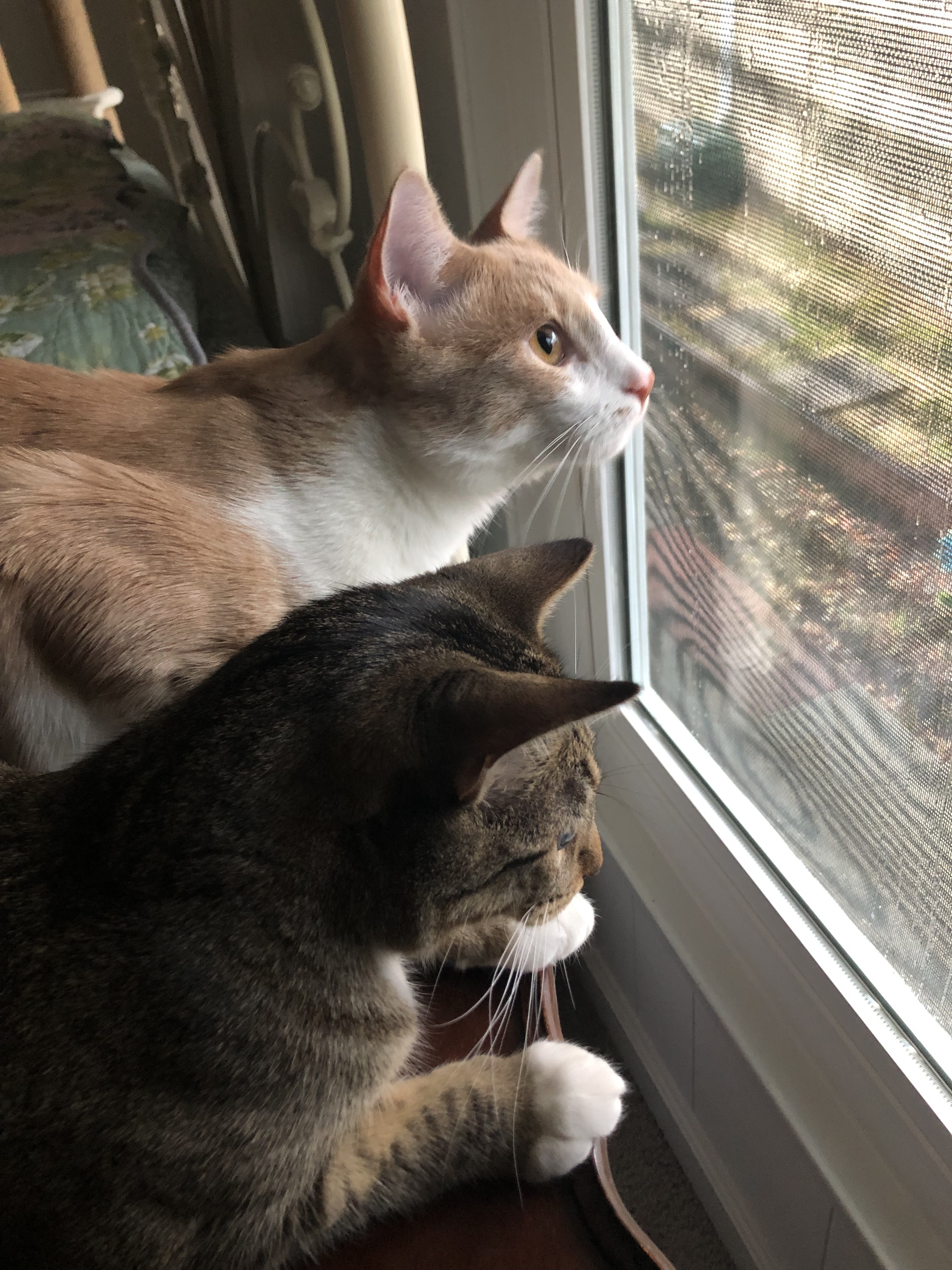 Scout and Atticus enjoying the rain on the windows and bird watching.
